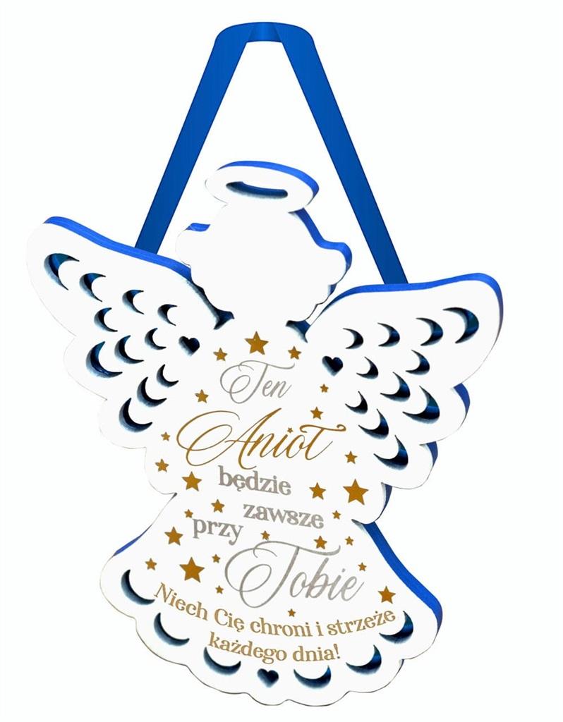 Zawieszka od serca w formie Aniołka to niezapomniany pomysł na prezent na Boże Narodzenie. Wykonana z solidnej płyty MDF z wyżłobionymi lustrzanymi zdobieniami i napisami z krótką sentencją Na tylnej ściance Aniołka jest tasiemka do zawieszenia na ścianie. Cechy szczególne: typ: zawieszka do powieszenia wielkość orientacyjna: wysokość: 14 cm, szerokość: 12,5cm (skrzydła), grubość: 7mm zdobienie: wzory wyżłobione w drewnie z lustrzaną folią, kolorowy napis okazja: Boże Narodzenie