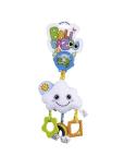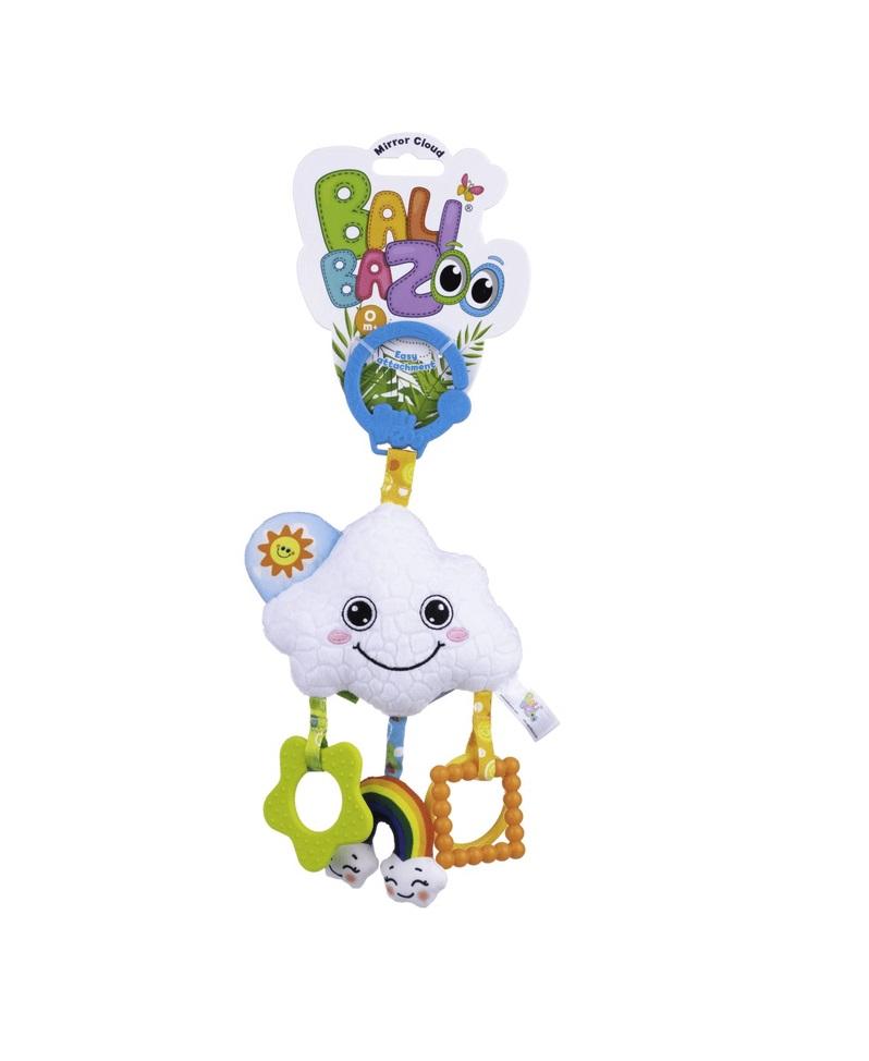 Wesoła chmurka umila Pluszakom zabawę, wprawiając je w wyśmienity nastrój. W swym wnętrzu kryje dzwoneczek, który przy potrząsaniu wydaje piękny dźwięk. Zabawkę zdobi szeleszczące słoneczko, gryzaczki w różnych kolorach i kształtach oraz bezpieczne lusterko do samopoznania maluszka. Wygodny uchwyt umożliwia przymocowanie zawieszki w dowolnym miejscu.