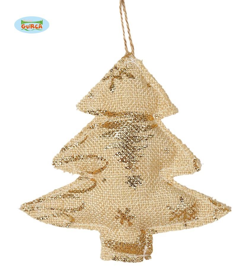 Materiałowa choinka ze złotymi wykończeniami. Idealnie będzie się komponować z zielenią choinki lub na świątecznym stole. 10cm.