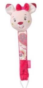 Zawieszka posiada malutką pluszową maskotkę - grzechotkę i sznureczek, który przewlekamy przez uchwyt smoczka.