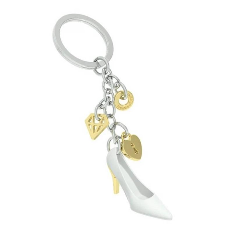 Brelok but szpilka z charmsami to piękny biały pantofelek z trzema złotymi zawieszkami diamentem, kłódką sercem i logowanym kółeczkiem. Brelok będzie wspaniałym prezentem dla kobiety