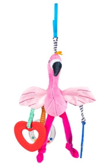 Rajskie klimaty na wyciągnięcie dziecięcej rączki! Kolorowy flaming rozweseli bobaska, zapewniając mu rozrywkę. Skrzydełka ptaszka zdobią dodatkowe zabawki, w postaci dwóch, kolorowych i miękkich gryzaczków. Do zabawki doczepiona jest także grzechocąca obręcz, wypełniona kolorowymi kuleczkami. Flaming uszyty został z materiałów o zróżnicowanych fakturach, dzięki czemu stymuluje zmysł dotyku malucha, zachęcając go do sensorycznego poznawania świata. Praktyczny uchwyt, w który wyposażona została zawieszka, umożliwia łatwe przymocowanie zabawki w dowolnym miejscu.