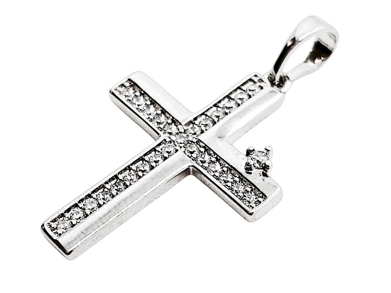 Krzyżyk został wykonany z wysokiej jakości stopu jubilerskiego, pokrytego grubą warstwą prawdziwego srebra w procesie zaawansowanej galwanizacji. Chłodny, lustrzany blask srebra idealnie podkreśla czystość osadzonych kamieni.