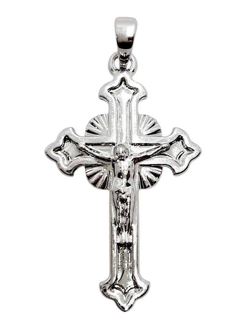 Krzyż został wykonany z wysokiej jakości stopu jubilerskiego i pokryty grubą warstwą prawdziwego srebra w procesie zaawansowanej galwanizacji. Dzięki temu zawieszka posiada nieskazitelną, białą barwę oraz szlachetny połysk, typowy dla wyrobów srebrnych wysokiej próby.
