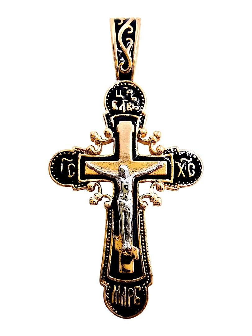Konstrukcja krzyża opiera się na wielowarstwowości. Wewnętrzna część ramion została wypełniona elegancką, czarną emalią, która stanowi doskonałe tło dla umieszczonego na niej prostego, złotego krzyża. Na jego planie spoczywa srebrna pasyjka - postać ukrzyżowanego Jezusa, wykonana z dbałością o najmniejsze detale. Całość wieńczy ażurowa ozdoba wokół zewnętrznych krawędzi, która imituje promienie bijące od postaci Chrystusa, nadając zawieszce sakralnego blasku.
