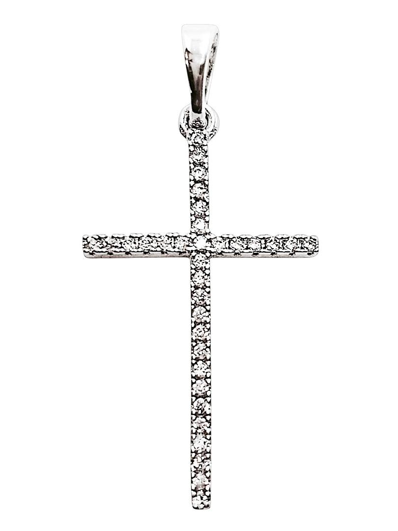 Cała powierzchnia frontowa została misternie wyłożona drobniutkimi, krystalicznymi cyrkoniami. Dzięki swojej filigranowej wielkości, kamienie te tworzą jednolitą, lśniącą linię, która subtelnie odbija światło, nie przytłaczając delikatnej formy zawieszki. Srebrzysta barwa w połączeniu z chłodnym blaskiem cyrkonii sprawia, że krzyżyk prezentuje się niezwykle świeżo i elegancko.