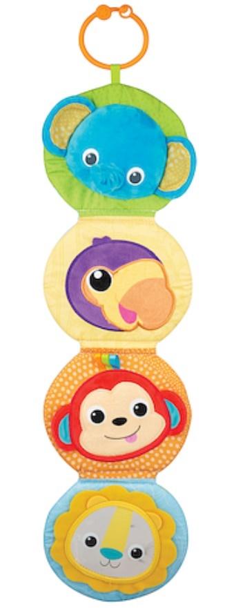 Zabawka z jednej strony ma nadruk zwierząt i wysokiego drzewa, które ciągnie się wzdłuż całej zawieszki. Druga strona zawieszki jest bogata w różne tekstury materiałów, na jednej z nich jest bezpieczne plastikowe lusterko. Na każdej stronie książeczki znajdziemy inną postać, która kojarzy się z dzikim safari. Książeczka ma również piszczałkę.