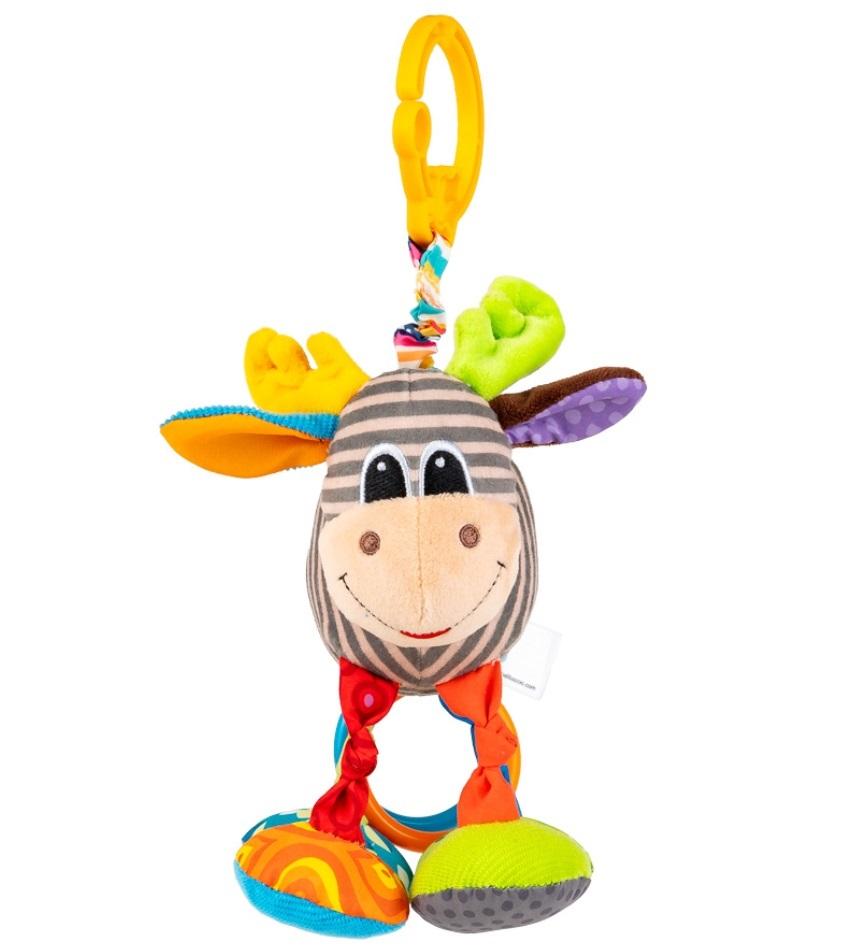 Alek to łoś do zadań specjalnych. Zabawia malucha, wesoło majtając nogami, dostarcza bodźców dotykowych, rozwijając tym samym zdolności poznawcze dziecka, a nawet wibruje! Zwierzak został uszyty z materiałów różniących się kolorem, wzorem i fakturą, a przy jego ogonku znajdują się dwa kolorowe kółeczka. Aby uruchomić wibrację, wystarczy pociągnąć łosia w dół, a ten podciągnie się na materiałowej harmonijce z powrotem w górę, zabawnie przy tym wibrując. Zwierzak wyposażony jest w praktyczną zawieszkę, dzięki czemu bez trudu przymocujesz go wybranym miejscu.