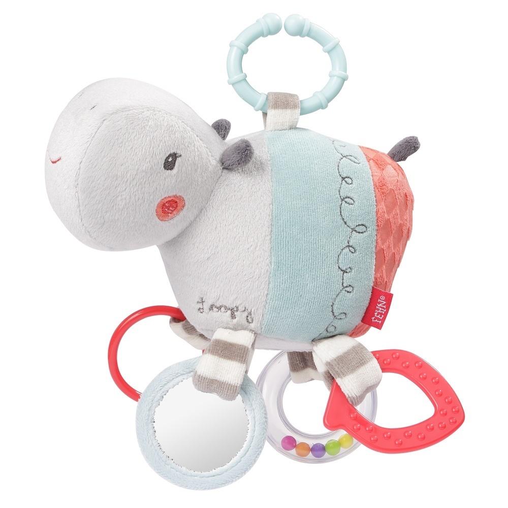 Zawieszka, Maskotka Edukacyjna,Hipopotam Loopy, z Kolekcji: Loopy i Lotta. Słodki, aksamitny w dotyku Hipopotam to prawdziwa uczta dla Twojego maluszka! Posiada bezpieczne lusterko, mały gryzak, który przyniesie ulgę na etapie ząbkowania oraz grzechotkę z tęczowymi paciorkami, na pewno zainteresuje Twojego maluszka. Zawieszkę za pomocą praktycznego klipsa można zamontować w dowolnym miejscu. Różne wzory, kontrastujące kolory i zróżnicowane powierzchnie zachęcają do odkrywania, chwytania i ściskania, co rozwija zdolności poznawcze. W okrągłym bezpiecznym lusterku Twoje dziecko może się przeglądać, co wzbudza dodatkową ciekawość. Z zachowaniem wielkiej dbałości o szczegóły, Maskotka oferuje wszystko, co sprawia, że dziecięce serduszka biją szybciej. Pomaga zrozumieć świat, w ciągu dnia i wieczorami przed snem. Wykonana jest z wielu, miłych w dotyku, materiałów. Rozwija logiczne myślenie, koncentrację, małą motorykę. Wzbudza ciekawość i stymuluje percepcję dziecka. Gryzaczek łagodzi ból podczas ząbkowania. Grzechotka i bezpieczne lusterko i ding dong wyzwalają chęć zabawy. Łatwa w montażu. Zawiera klips do zawieszenia na łóżeczku, wózku, nosidełku itp. Można prać. Wszystkie zabawki niemieckiej marki FEHN są bezpieczne dla dzieci od 0 lat. Wykonane są z najlepszej jakości materiałów. Spełniają normy EN71, CE, badane w instytutach Stiftung Warentest lub kotest.