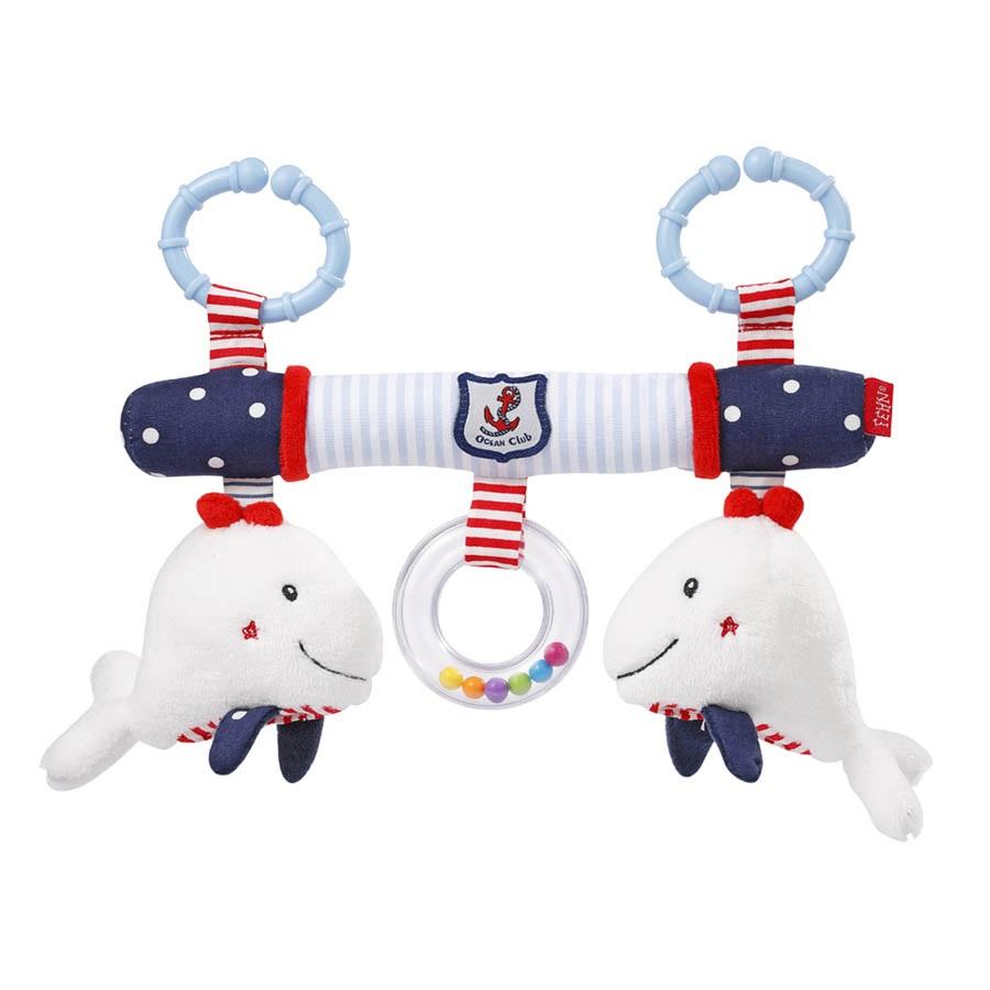 Zabawka nadająca się do zamontowania na poręczy każdego wózka, łóżeczka lub kojca. Aksamitnie delikatna w dotyku, z trzema zawieszkami: dwoma pluszowymi wielorybami z grzechotką oraz pierścieniem wypełnionym tęczowymi paciorkami. Zabawka służy do oglądania, chwytania i znakomitej zabawy oraz trenowania koordynacji ręka-oko.