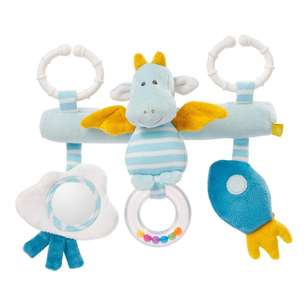 Zabawka nadająca się do zamontowania na poręczy każdego wózka, łóżeczka lub kojca. Aksamitnie delikatna w dotyku, z trzema zawieszkami: Rakietą i uroczym Smokiem z grzechotką - pierścieniem wypełnionym tęczowymi paciorkami oraz Chmurką - lusterkiem. Zabawka służy do oglądania, chwytania i znakomitej zabawy oraz trenowania koordynacji ręka-oko.