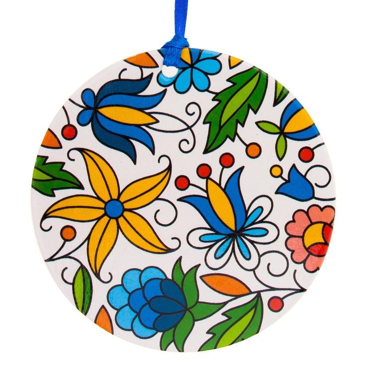 Ozdoba choinkowa kaszubska - kolorowe kwiaty z wycinanki: zdobienia stylizowane na ludowo,ozdoba kaszubska zachwyca intensywną gamą kolorów i ciekawymi kompozycjami,barwne folkowe wzory inspirowane tradycyjnymi haftami kaszubskimi,tradycyjne wzory folk z regionu kaszubskiego połączone w jedną niespotykaną i oryginalną kompozycję,wykonana grubej tektury i papieru pokrytego folią błysk,dwustronny nadruk,świetna ozdoba świąteczna