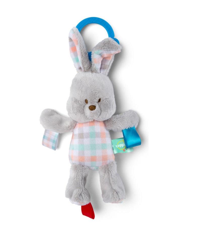 Zawieszka pluszak przytulak z metkami - do maskotki doszyte kolorowe metki, za które dziecko może łapać i ciągnąć. Przy każdym poruszeniu zabawka wydaje dźwięki. Zabawka dla dzieci od dnia narodzin.
