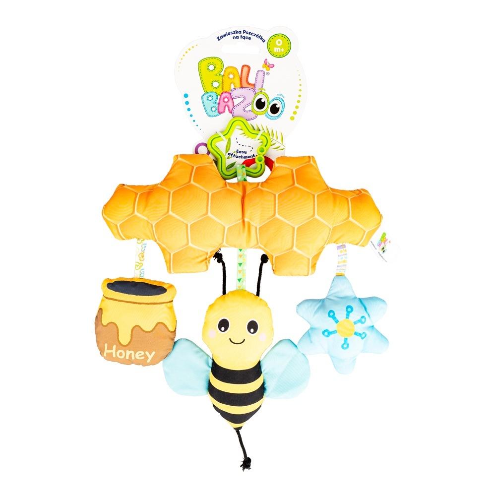 Wesoła zawieszka bawi, kryjąc w sobie wiele niespodzianek! Na plastrze miodu, wyposażonym w kryty dzwoneczek, buja się, zabawnie popiskując, uśmiechnięta pszczółka. Towarzyszy jej szeleszcząca beczułka miodu i piszczący kwiatek. Zabawka posiada praktyczną zawieszkę w kształcie gwiazdki, która umożliwia przymocowanie jej w dowolnym miejscu.