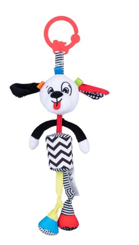 Ten zabawny psiak dostarczy rozrywki podczas pierwszych spacerów malucha. W jego brzuchu kryje się dzwoneczek, który przy poruszaniu zabawką, wydaje miły dla ucha dźwięk. Piesek posiada szeleszczące uszy i materiałowe metki o zróżnicowanej fakturze, a jego kontrastowe kolory stymulują zmysł wzroku dziecka. Zabawka została wyposażona w praktyczną zawieszkę, która umożliwia przyczepienie psiaka w dowolnym miejscu.