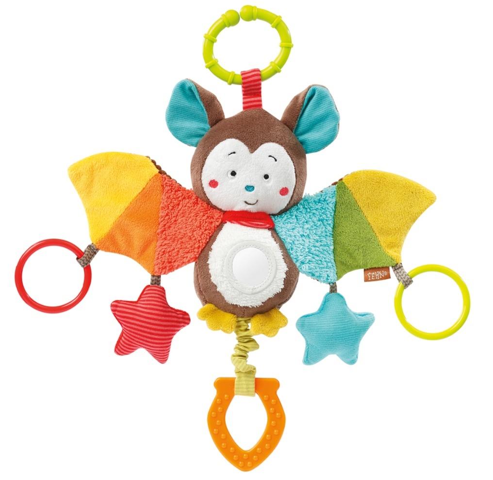Zawieszka, maskotka wibrująca Nietoperz, z kolekcji: Kumple z Dżungli. Magiczna zabawka interaktywna z kolekcji: Kumple z Dżungli. To prawdziwa uczta dla Twojego maluszka! Barwny Nietoperz, wyposażony w bezpieczne lusterko, czerwoną gwiazdkę, która po naciśnięciu wydaje delikatny dźwięk, oraz niebieską gwiazdkę, która grzechocze, na pewno zainteresuje Twojego maluszka. Jeśli pociągniecie za pomarańczowy gryzaczek, zabawka zacznie delikatnie wibrować, co jest szczególnie ciekawym elementem zabawki. Nietoperza, za pomocą praktycznego uchwytu w kształcie litery C, można zamontować w dowolnym miejscu. Różne wzory, kontrastujące kolory i zróżnicowane powierzchnie zachęcają do odkrywania, chwytania i ściskania,co rozwija zdolności poznawcze. W okrągłym bezpiecznym lusterku Twoje dziecko może się przeglądać, co wzbudza dodatkową ciekawość. Z zachowaniem wielkiej dbałości o szczegóły, Jeż oferuje wszystko, co sprawia, że dziecięce serduszka biją szybciej. Pomaga zrozumieć świat, w ciągu dnia i wieczorami przed snem. Wykonana jest z wielu, miłych w dotyku, materiałów. Rozwija logiczne myślenie, koncentrację, małą motorykę. Wzbudza ciekawość i stymuluje percepcję dziecka. Wibrujący Nietoperz z bezpiecznym lusterkiem, grzechotką i piszczałką wyzwala chęć zabawy. Do zawieszenia na łóżeczku, wózku, nosidełku itp. Można prać. Wszystkie zabawki niemieckiej marki FEHN są bezpieczne dla dzieci od 0 lat. Wykonane są z najlepszej jakości materiałów. Spełniają normy EN71, CE, badane w instytutach Stiftung Warentest lub kotest.