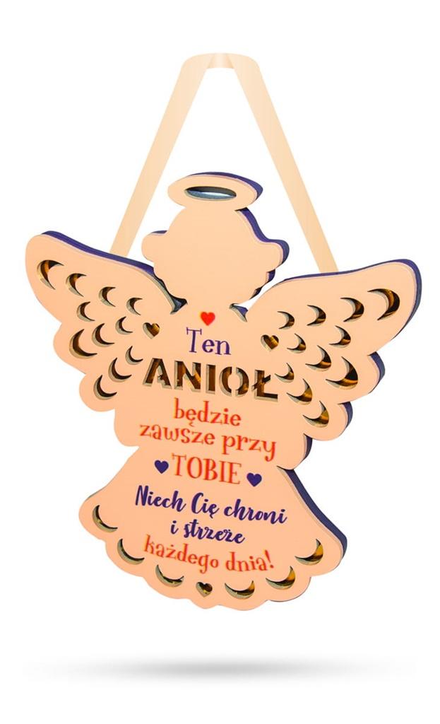 Zawieszka od serca w formie Aniołka to niezapomniany pomysł na prezent. Wykonana z solidnej płyty MDF z wyżłobionymi lustrzanymi zdobieniami i napisami z krótką sentencją Na tylnej ściance ramki jest haczyk do zawieszenia na ścianie. Cechy szczególne: typ: zawieszka do powieszenia wielkość orientacyjna: wysokość: 14 cm, szerokość: 12,5 cm (skrzydła), grubość: 7 mm zdobienie: wzory wyżłobione w drewnie z lustrzaną folią, kolorowy napis