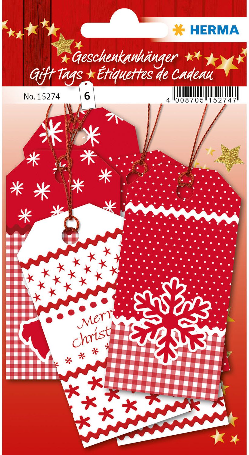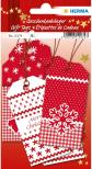 Etykiety z motywami świątecznymi wykonane z tektury, zadrukowane z obu stron.
