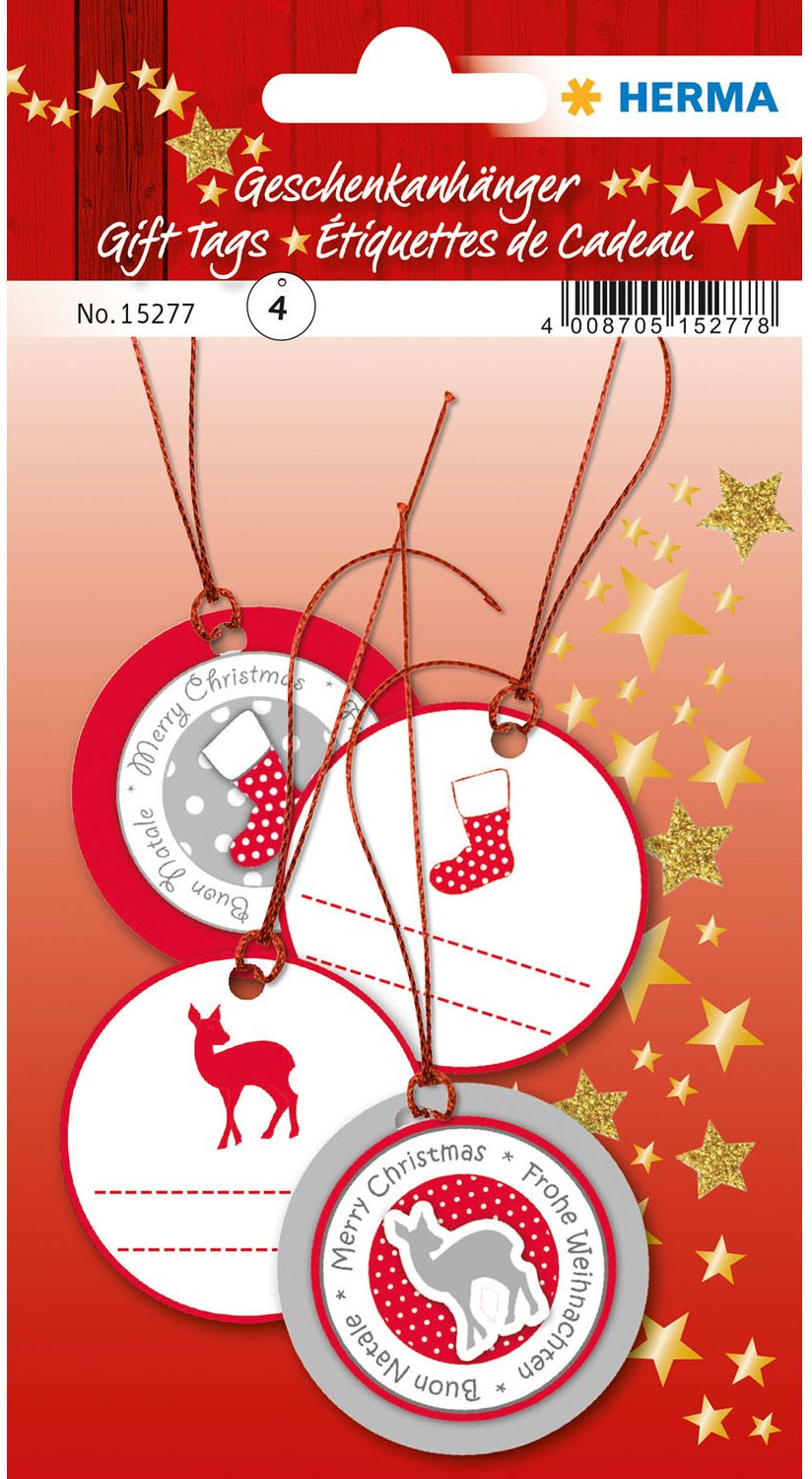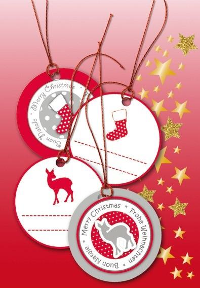 Etykiety z motywami świątecznymi wykonane z tektury, zadrukowane z obu stron.