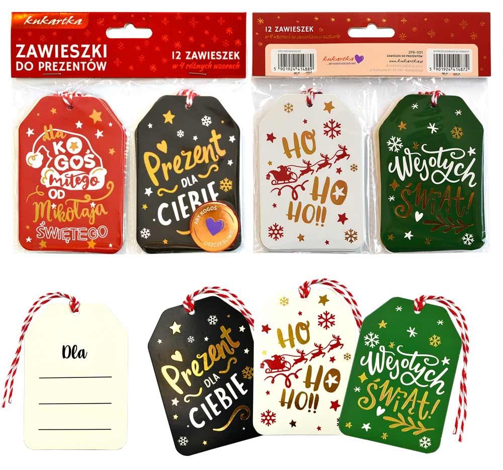 Zawieszki do prezentu ZPR-001. Zestaw zawiera 12 zawieszek w 4 różnych wzorach. Zawieszki do prezentu ze sznurkiem to doskonały sposób na dodanie osobistego akcentu do Twoich podarunków. Każda zawieszka jest uszlachetniona metalizowaną folią hot-stamp oraz wyposażona w sznurek, co umożliwia łatwe przymocowanie do prezentu. Zawieszki doskonale nadają się do wpisania imienia obdarowywanej osoby lub krótkich życzeń czyniąc każdy podarunek wyjątkowym. Specyfikacja: Wymiary karnecika: 7,0 x 10,2 cm Wymiary opakowania: 16,2 x 0,5 x 15 cm (długość x szerokość x wysokość) zdobienia: metaliczna folia, sznurek wnętrze: miejsce w środku karnecika na wpisanie imienia obdarowanej osoby lub własnych życzeń okazja: BN