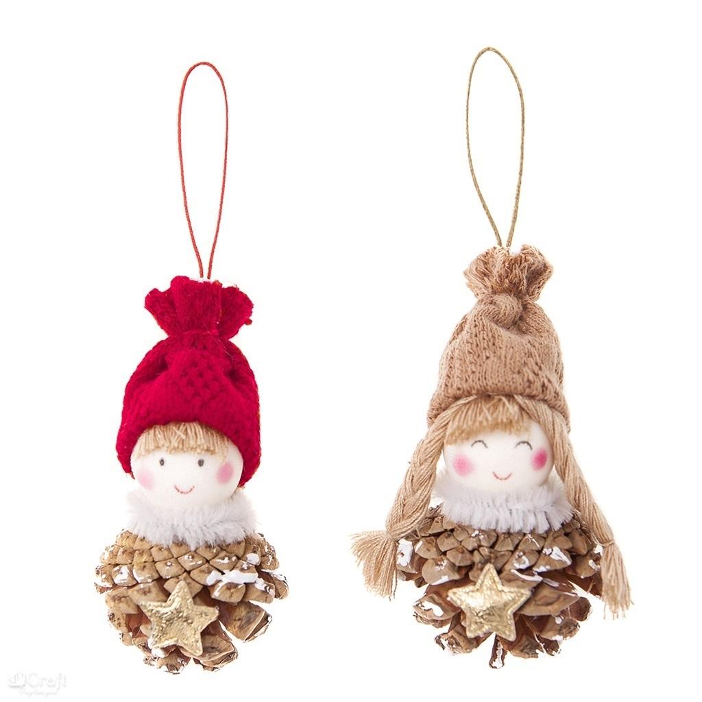 Podstawą zawieszek są delikatnie zdobione białą farbą i złotymi gwiazdkami szyszki. Laleczki udekorowane są dodatkowo dzianinowymi czapeczkami w beżowym oraz czerwonym kolorze i szaliczkami z puchatego, kreatywnego drucika.