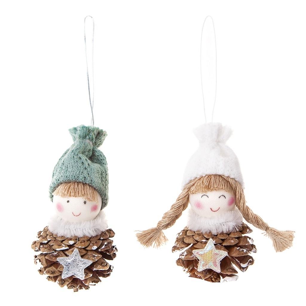 Podstawą zawieszek są delikatnie zdobione białą farbą i srebrnymi gwiazdkami szyszki. Laleczki udekorowane są dodatkowo dzianinowymi czapeczkami w białym oraz miętowym kolorze i szaliczkami z puchatego, kreatywnego drucika.