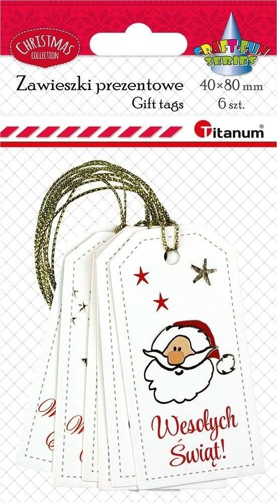 Zawieszki prezentowe z napisem Wesołych Świąt 40x80mm 3 wzory: gwiazdka, głowa Mikołaja, choinka, dwustronny zadruk z miejscem do wypełnienia 6szt.