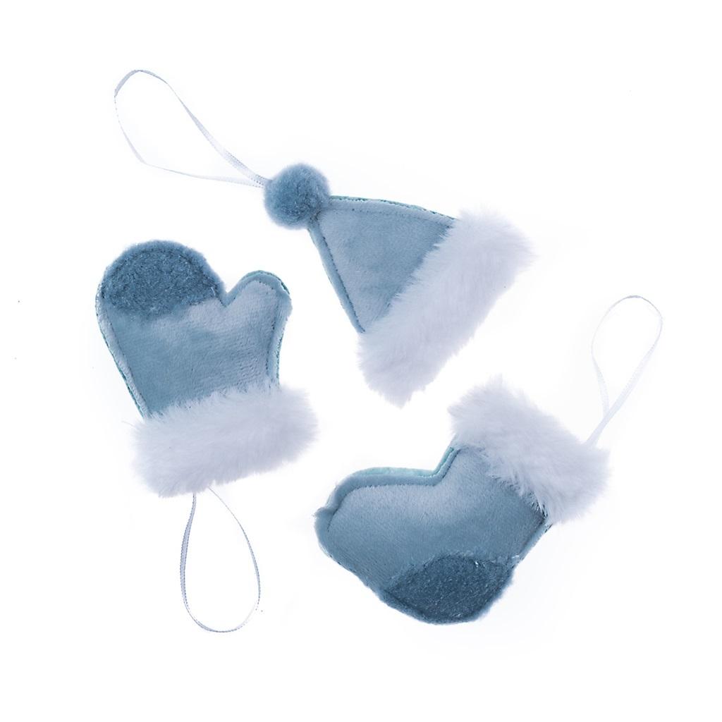 Niebieskie zawieszki z materiału z dodatkiem delikatnego, białego futerka to uroczy dodatek, który podkreśli zimowy klimat projektów DIY.