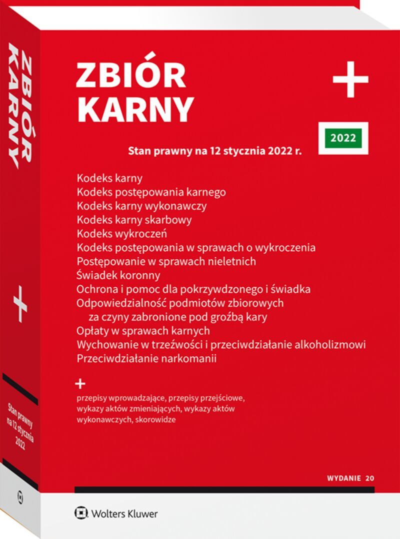 Stan prawny: 12 stycznia 2022 r. Oddawany do rąk Czytelników zbiór przepisów obejmuje: K.K., K.P.K., K.K.W., K.K.S., K.W., K.P.W., U.P.S.N., U.Ś.K., U.O.P.P.Ś. oraz U.O.P.Z., U.O.K., U.W.T.P.A., U.P.N. K.K. – uwzględniono zmiany dotyczące m.in. nowej przesłanki orzekania środka karnego w postaci pozbawienia praw publicznych oraz zakazu zajmowania określonych stanowisk, wykonywania określonych zawodów lub pracy; penalizacji czynów polegających na fałszywym zawiadomieniu o zagrożeniach.