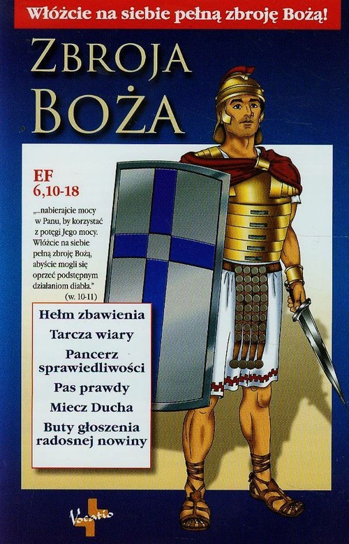 Broszura Zbroja Boża na podstawie Listu do Efezjan opisuje każdy element starożytnej, rzymskiej zbroi, wzbogacając opisy o tło historyczne, a także ukazując ich zastosowanie w czasach współczesnych dla duchowej walki, jaką toczymy z siłami ciemności. Paweł Apostoł pokazuje, jak ważne jest pełne zrozumienie funkcji poszczególnych elementów zbroi, w jaką ? poprzez Ducha Świętego i swoje Słowo ? wyposaża nas Bóg. Pokazuje także ich praktyczne zastosowanie w codziennym życiu z wiary.Broszurka dokładnie opisuje każdy element tej zbroi, czyli:- Hełm zbawienia - Pas prawdy- Pancerz sprawiedliwości - Miecz Ducha - Buty gotowości głoszenia radosnej nowiny o pokoju z Bogiem - Tarcza wiaryPoszczególne elementy zbroi opisane są w syntetycznej formie w postaci przejrzystych tablic. Oprócz nich broszurka zawiera także kolorowe ilustracje i powiązane z tematem inne cytaty biblijne.