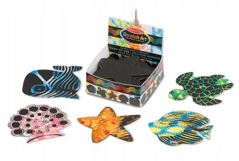 Łatwe w użyciu, niesamowite rezultaty i niespodzianki ujawniane z każdym zadrapaniem, Scratch Art Ocean Notes to unikalny sposób na tworzenie wiadomości, wzorów, zawieszek na prezenty i nie tylko! Zdrap czarną powłokę, aby odsłonić pięć różnych kolorowych wzorów. Każde pudełko zawiera 125 karteczek (około 3,5 cala na 3,5 cala) w pięciu kształtach o tematyce oceanicznej (ryba, żółw, gwiazda morska, muszla i wieloryb). Dzieci w wieku 4 lat i starsze mogą używać drewnianego rysika do dodawania projektów, bazgrołów, wzorów, słów, obrazków i innych elementów, aby stworzyć naprawdę jedyne w swoim rodzaju dzieła sztuki! Notes i rysik przechowywane są w poręcznym pudełku na biurko. Wiek: 4+, Wymiary: Produkt: 8,89 x 1.5x 8,89 Opakowanie: 8,89 x 8,89 x 3,81 cm .
