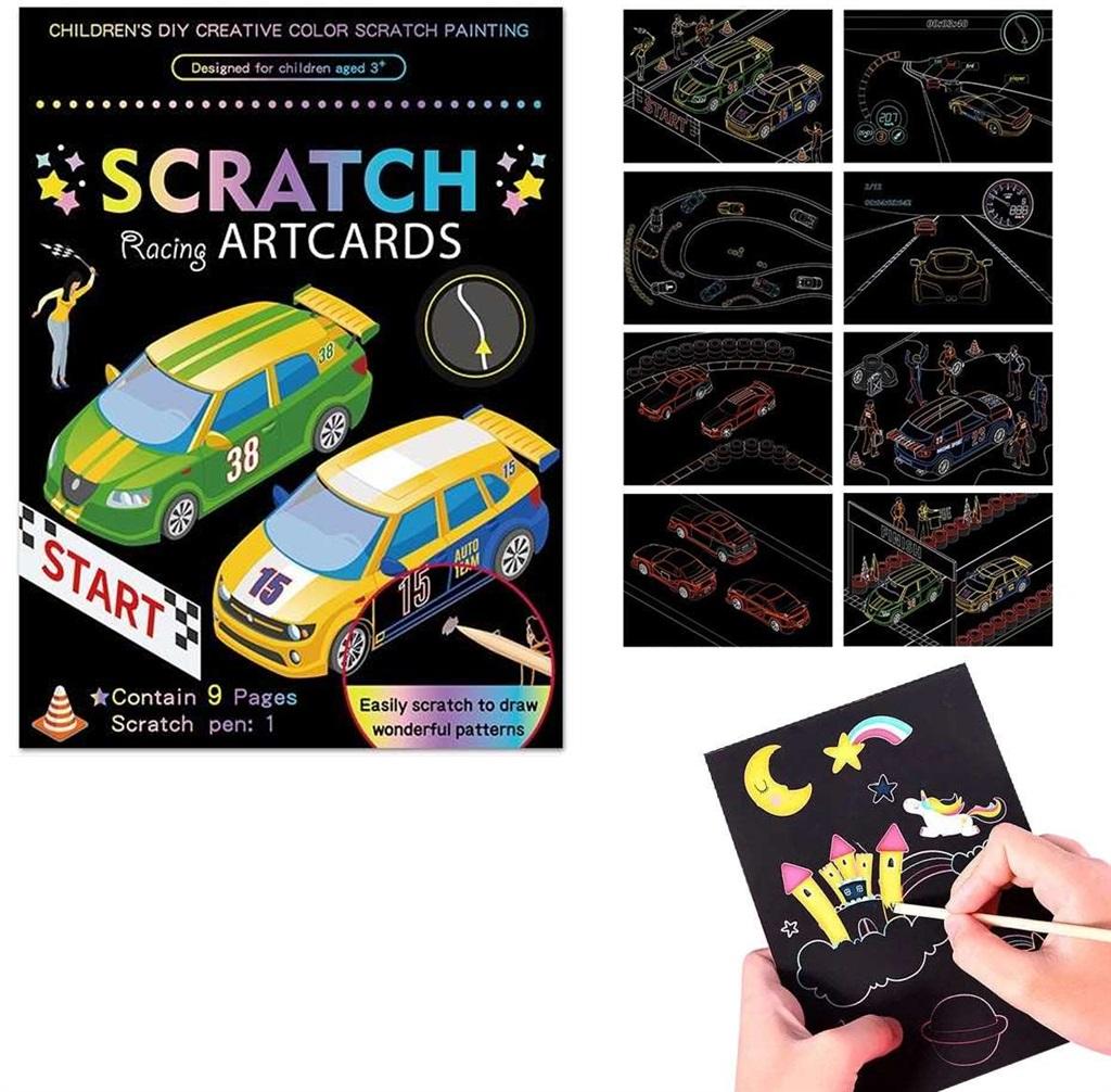 Zdrapywanki w formie 9 czarnych kart pokrytych zdrapywalną farbą.Weź do ręki drewniany patyczek i stwórz swój niepowtarzalny obrazek z autem.