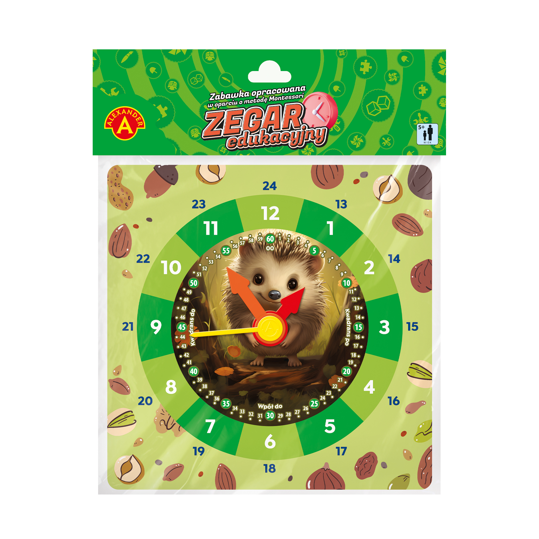 Zabawka pozwala w przyjemny i praktyczny sposób opanować znajomość zegara w towarzystwie sympatycznego jeżyka z ilustracji.