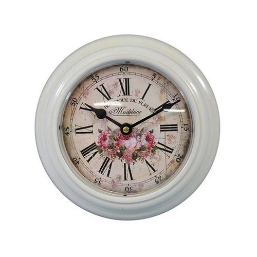 Zegar w stylu retro z piękną, stylową tarczą i wskazówkami. Zdobiony motywem kwiatowym. To nie tylko praktyczny odmierzacz czasu, ale przede wszystkim oryginalna i ciekawa dekoracja. Całość utrzymana w stylu retro. Starannie wykonany z metalu oraz płyty MDF. Wykończony białą farbą. Zegar jest wykonany w modnym stylu vintage shabby chic, polegającym na celowym nadawaniu dekorowanym przedmiotom antycznego wyglądu. Znajdujące się na nim przetarcia są celowym zabiegiem. Przeznaczony do zawieszenia na ścianie. Taki zegar to również doskonały pomysł na wyjątkowy prezent! Informacje o produkcie: - Zegar do powieszenia na ścianie - Kolor: biały - Motyw kwiatowy - Zasilanie bateryjne - Wymiary w cm: 21x21x4,5