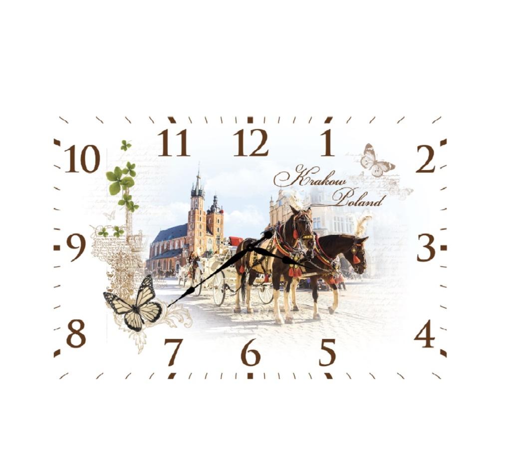 Zegar Retro z obrazkiem Krakowa. Wykonany z wysokiej jakości płyty pilśniowej (MDF) z przyklejonym specjalną metodą zadrukowanym papierem. Na obrazku widnieje Kościół Mariacki i dorożka z końmi ozdobione kwiatami i motylami, duże cyfry arabskie i napis. Zegar z 2 wskazówkami i z płynącym sekundnikiem. Z tyłu znajduje się mechanizm na baterię AA i otwór do zawieszenia na ścianie. Zapakowany w białe, kartonowe pudełko. Produkt wyprodukowany w Serbii. Wymiary: 410 x 4 x 280 mm