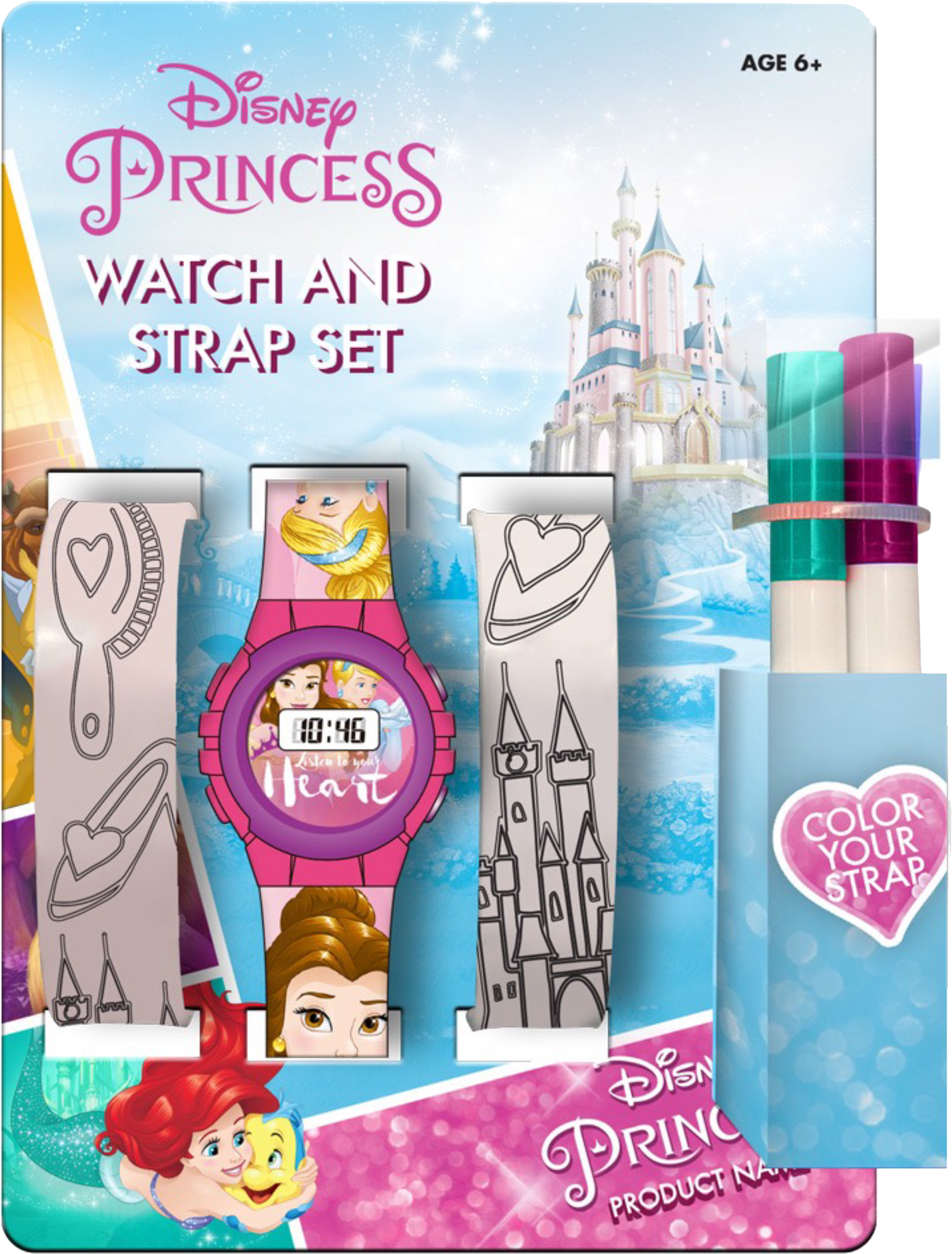 Księżniczki Disneya, Zegarek Elektroniczny Plus Dwa Paski Do Malowania. Oryginalny zegarek elektroniczny Disneya z wizerunkami Księżniczek. Zegarek posiada tarczę elektroniczną oraz mechanizm kwarcowy zasilany pojedynczą baterią. Zestaw składa się z cyfrowego zegarka z regulacją, na barwnym pasku. Ponadto, posiada 2 dodatkowe paski z grafiką i 4 flamastry do ich malowania. Zestaw idealny na prezent. Wymiary: średnica tarczy: 3 cm.