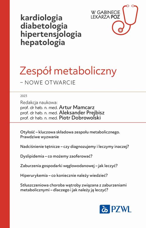 Wydanie z serii „W gabinecie lekarza POZ” przedstawiające złożony interdyscyplinarny problem diagnostyczno-terapeutyczny, jakim jest zespół metaboliczny. Mija już 35 lat od czasu, kiedy Gerald Reaven sformułował nowoczesną definicję zespołu metabolicznego. W ciągu tych lat przez sale konferencyjne i piśmiennictwo naukowe przetoczyła się burzliwa dyskusja wielu autorytetów medycznych, którzy poddawali często krytycznemu osądowi potrzebę istnienia takiej jednostki chorobowej. Warto pamiętać o pierwszych opisach z 1761 roku współwystępowania kluczowych elementów tego zespołu, pokazanych przez jednego z ojców współczesnej patologii, Morgagniego, czy polskim śladzie prof. Jakuba Węgierki z lat 50-tych XX wieku, kiedy pisał o cukrzycy skojarzonej z otyłością i nadciśnieniem tętniczym. Dziś nie mamy wątpliwości, że wobec epidemii otyłości należy szeroko mówić i pisać o zespole metabolicznym ? nikt już nie kwestionuje jego istnienia. W 2022 roku grupa autorów różnych specjalności, akademików z wieloletnim doświadczeniem praktycznym, przygotowała dokument, który pokazuje nowy paradygmat rozpoznawania i leczenia tego często skomplikowanego układu powiązań patogenetycznych i klinicznych. Uznaliśmy jednak, że warto docierać szeroko, pisać o kluczowych składowych tego zespołu, promować tę wiedzę wśród lekarzy. Tak powstało to monograficzne opracowanie, w którym w bardzo praktyczny sposób staraliśmy się pokazać kluczowe elementy ZM. Nasze zaproszenie przyjęli bez wahania naukowcy, a zarazem lekarze praktycy, którzy na co dzień zajmują się takimi pacjentami. Powstało praktyczne kompendium, które, mamy taką nadzieję, ułatwi procesy diagnostyki i terapii w tej wysoko zagrożonej grupie. Gorąco zachęcamy Państwa do lektury.