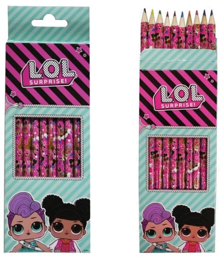W zestawie znajduje się 10 kredek w różnych kolorach z wzorami z kolekcji L.O.L.