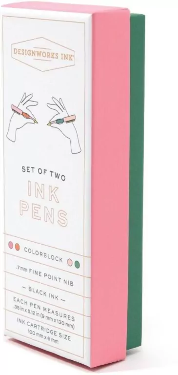 Każdy zestaw zawiera dwa długopisy wypełnione głębokim czarnym atramentem i ozdobionymi żywymi, kontrastującymi kolorami z matowym wykończeniem.
