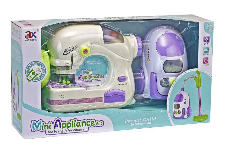 Interaktywny zestaw dla dzieci, zabawkowa maszyna do szycia + odkurzacz. Całość zasilana bateriami, wydaje dźwięki i świeci.