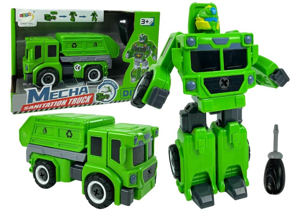Zestaw DIY 2 w1 Śmieciarka Robot Zielony Transformacja Robot śmieciarka to połączenie dwóch możliwości zabawy. Czas odkryć tajemnice tego niespotykanego autka! Zestaw składający się z autka do składania będzie rewelacyjną zabawką dla każdego małego majsterkowicza. Połączenie zabawy z możliwością demontażu wybranych elementów czyni zabawkę rewelacyjną, a frajda z zabawy trwa na długie godziny. Niepozorna zielona śmieciarka kryje w środku niesamowitego robota. Po rozłożeniu z naczepy powstanie tułów robota, z kół- ręce i nogi. Śrubokręt pozwoli na rozkręcanie i dokręcanie części. Precyzja i zdolności manualne będą bardzo dobrze rozwijać się w trakcie zabawy. Na opakowaniu znajduje się dokładna instrukcja jak zmienić autko w robota. Wymiary autka: 15 cm x 6 cm x 7 cm Wymiary opakowania: 21 cm x 10 cm x 13 cm Zabawka przeznaczona dla dzieci powyżej 3 roku życia. Zgodna z certyfikatem CE i normą EN71.