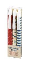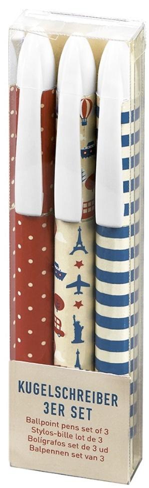 Zestaw 3 Długopisów, Podróże. Długopisy kulkowe z możliwością wymiany wkładu. Tusze: 2 w kolorze niebieskim, 1 czarny. Zapakowane w plastikowe pudełko.