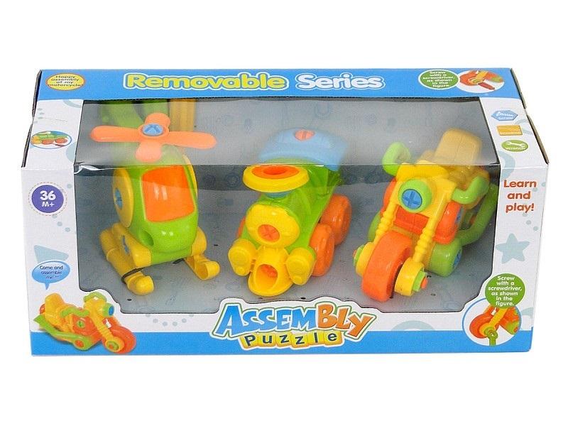 Zestaw 3 pojazdów do skręcania z narzędziami.