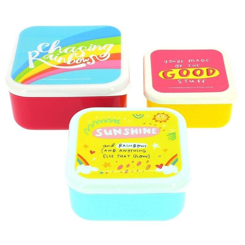 W skład zestawu wchodzą trzy plastikowe, kwadratowe pojemniki: * największy (wymiary: wysokość 5,5 cm szerokość :11 cm) dół pojemnika jest w pastelowym różowym kolorze + zamykany tęczową pokrywką * średni (wymiary: wysokość 4,5 cm szerokość :10 cm) dół pojemnika jest w pastelowym błękitnym kolorze + zamykany żółtą pokrywką ozdobioną napisami i grafikami * najmniejszy (wymiary: wysokość 4cm szerokość :8,5 cm) dół pojemnika jest w żółtym kolorze + zamykany różową pokrywką ozdobioną napisami