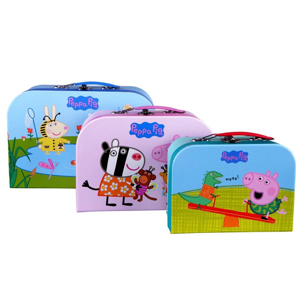 Zestaw 3 Walizek, Świnka Peppa Uroczy zestaw 3 walizek ozdobiony grafikami z kultowej bajki Świnka Peppa. Taki zestaw to doskonały pomysł na fantastyczną zabawę. Walizki są wykonane z bardzo solidnej tektury, dzięki czemu wytrzymają kilka uderzeń. Walizki ozdobią pokój dziecięcy, a także są praktyczne do przechowywania zabawek i innych drobiazgów. Każda posiada praktyczny uchwyt i jest łatwa do przenoszenia. Elegancko wykończone w środku, mogą być doskonałym elementem zabawy. Szczegółowe informacje o produkcie: Zestaw zawiera 3 walizki, każda o innym rozmiarze i z innymi grafikami. Jedna wkładana w drugą, stanowią doskonały komplet do zabawy. Wszystkie zostały wyposażone w wygodny uchwyt oraz metalowe zapięcie. Walizka wykonana z twardego kartonu, elegancko wykończona w środku, może być doskonałym elementem zabawy. Materiał : tektura. Kategoria wiekowa: 3+. Wymiary walizek: mała - 20 cm x 14,5 cm x 8 cm, średnia - 25 cm x 17,5 cm x 8,5 cm. Wymiary opakowania: 30 cm x 21 cm x 10 cm. / walizka duża/. Produkty Barbo Toys są projektowane w Danii, ze szczególną dbałością o zrównoważony rozwój i wysokiej jakości materiały. Zabawki są wytwarzane zgodnie z filozofią "nauka przez zabawę" i aktywnie wspierają i stymulują zarówno wyobraźnię jak i edukację dziecka, przy tym charakteryzują się doskonałym skandynawskim wzornictwem.