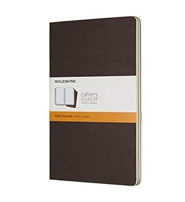 Zestaw 3 zeszytów Moleskine Cahier, o rozmiarze 13 x 21 cm (Large) w kawowym kolorze. Zeszyty w elastycznej kartonowej oprawie z widocznym na grzbiecie szyciem. Posiadają kieszeń na końcu ułatwiającą przechowywanie luźnych kartek, czy wizytówek. Dodatkowo w środku znajduje się 16 kartek z perforacją umożliwiającą wyrwanie.