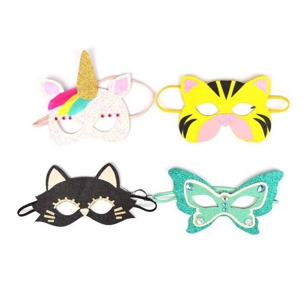 Zestaw dużych (15 x 20 cm) brokatowych masek w kształtach: kot, tygrys, motyl, jednorożec to sprawdzony gadżet na zabawę przebieraną oraz bal karnawałowy. Maski wykonane są z trwałego kartonu z dbałością o detale i szczegóły. Wygodna gumka zapewnia bezpieczne noszenie maski.