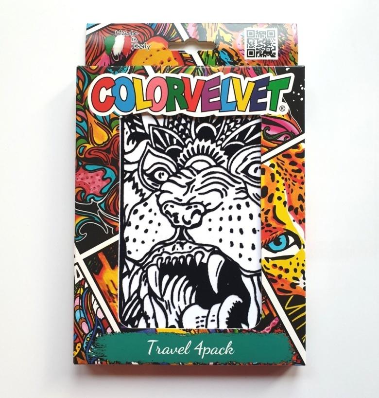 Zestaw 4 małych kolorowanek welwetowych wraz z flamastrami - idealny towarzysz podróży.