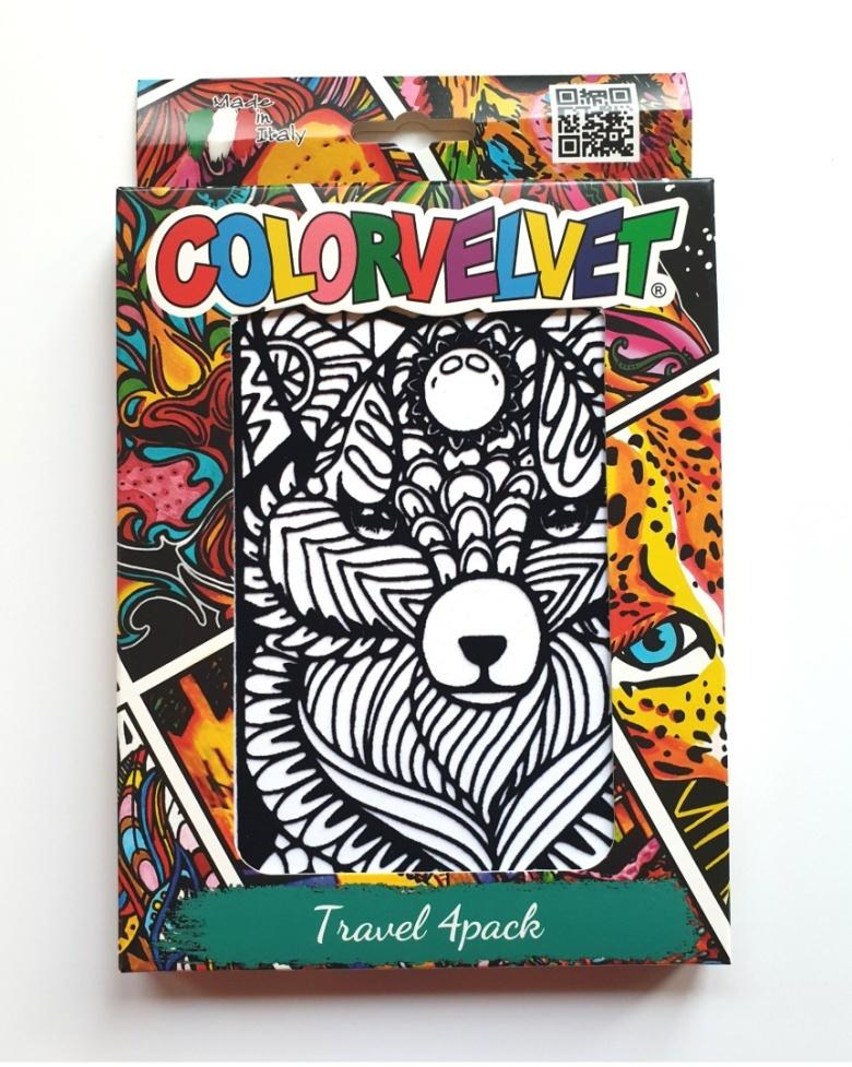 Zestaw 4 małych kolorowanek welwetowych wraz z flamastrami - idealny towarzysz podróży.