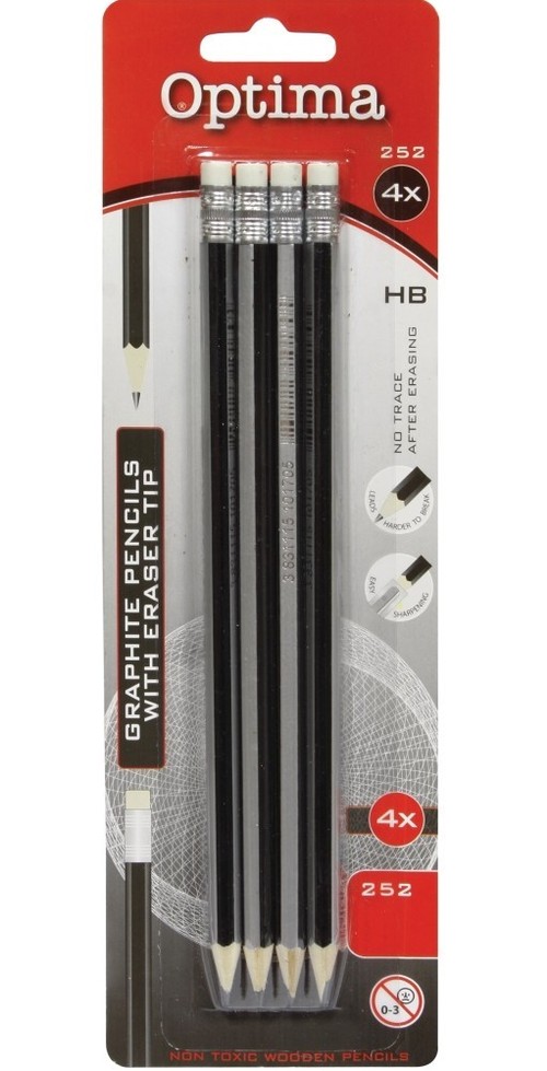 Pakiet 4 ołówków Optima twardość HB na blistrze. Komplet 12 sztuk w pudełku.